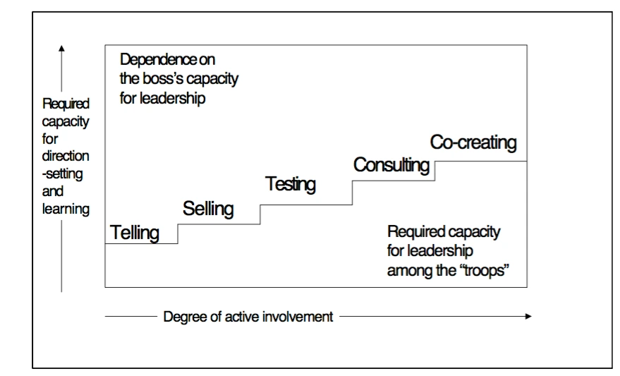 Senge talks about creating a shared vision for an organisation. He sets out to define some starting point for the creation of a shared vision, believing that you need to move from one stage to the next; from “telling” people what the vision is to ultimately get to a point where the shared vision is “co-created”.