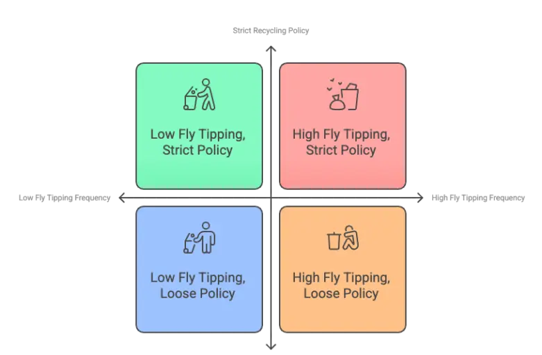 On one axis, we track fly tipping frequency, a proxy for civic engagement, waste accessibility, and enforcement. On the other, we place local recycling policy strictness, capturing how open or restricted municipal services are in accepting various types of waste.